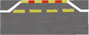 خطوط متقاطعة متوازية : خطوط مسلك في شارع ذو ثلاثة مسالك أو اكثر - على من يسوق مركبة أو حيوان أن يسوق مركبته أو الحيوان في المسلك الأيمن الأقصى ولا يجوز له عبور الخطوط بجسم المركبة أو بقسمٍ منه إلا من اجل التجاوز أو من اجل تنفيذ أمرٍ قانوني |